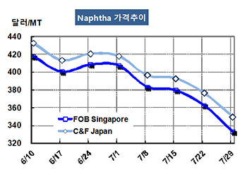나프타(Naphtha)는 하락세가 가속화되고 있다. 나프타 가격은 7월29일 CFR Japan 톤당 350달러로 26달러 폭락했고 FOB Singapore 역시 333달러로 30달러 떨어졌다. 표, 그래프 : < Naphtha 가격추이> <화학저널 2016/08/01> |