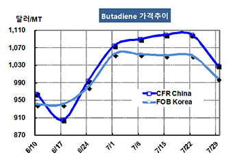 부타디엔(Butadiene)은 드디어 폭락세로 전환됐다. 부타디엔 가격은 7월29일 FOB Korea 톤당 1000달러로 52달러 폭락했고 CFR SE Asia는 960달러로 95달러 떨어졌다. CFR China도 1030달러로 70달러 폭락했다. 표, 그래프 : < Butadiene 가격추이> <화학저널 2016/08/01> |