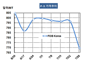 P-X(Para-Xylene)는 800달러에서 멀어져갔다. P-X 가격은 7월29일 FOB Korea 톤당 770달러로 26달러 하락했고 CFR SE Asia도 785달러로 27달러 떨어졌다. 표, 그래프 : < P-X 가격추이 > <화학저널 2016/08/02> |