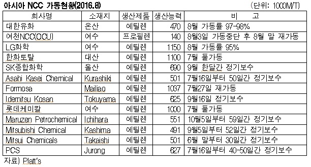 여천NCC가 OCU(Olefin Conversion Unit) 14만톤을 가동중단했다. 한편, 에틸렌 시장은 2016년 하반기 NCC 정기보수가 집중됨에 따라 수급타이트로 전환될 가능성이 높아지고 있다. 표, 그래프 : < 아시아 NCC 가동현황(2016.8) > <화학저널 2016/08/09> |