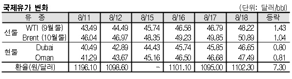 8월18일 50.89달러로 1.04달러 상승 … 두바이유 46.65달러