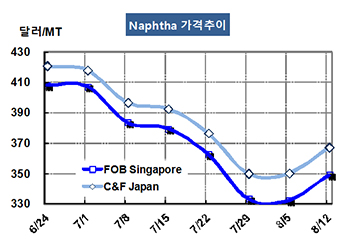 나프타(Naphtha)는 국제유가를 타고 상승세로 전환됐다. 나프타 가격은 8월12일 CFR Japan 톤당 367달러로 17달러 상승했고 FOB Singapore도 349달러로 17달러 올랐다. 표, 그래프 : < Naphtha 가격추이 > <화학저널 2016/08/19> |