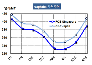 나프타(Naphtha)는 갑자기 폭등세로 돌변했다. 나프타 가격은 8월19일 CFR Japan 톤당 408달러로 41달러 폭등했고, FOB Singapore 역시 389달러로 40달러 올랐다. 표, 그래프 : < Naphtha 가격추이 > <화학저널 2016/08/22> |