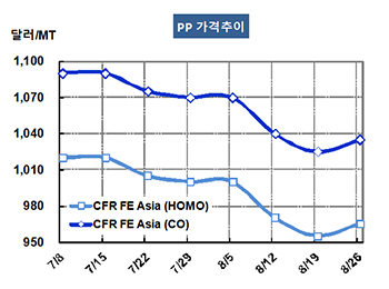 PP(Polypropylene)는 하락세를 접고 상승세로 전환됐다. PP 가격은 8월24일 Raffia 및 Injection 그레이드 기준 CFR FE Asia 톤당 965달러로 10달러 상승했고 CFR SE Asia는 995달러로 25달러, CFR S Asia는 1010달러로 15달러 올랐다. IPP Film 및 BOPP는 FEA가 985달러 및 975달러로 10달러, SEA는 1015달러로 25달러 및 30달러, SA는 1030달러로 15달러 상승했다. 표, 그래프 : < PP 가격추이 > <화학저널 2016/08/30> |