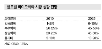 글로벌 바이오화학 시장은 2025년 4400억달러에 달해 전체 화학시장의 약 22%를 차지할 것으로 전망되고 있으며 국내에서는 CJ제일제당, GS칼텍스, SK에너지 등이 참여하고 있다.