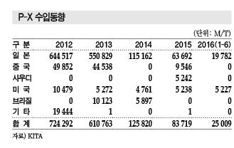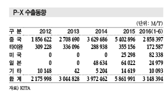 P-X 수출량은 2012년 217만5998톤, 2013년 304만4828톤, 2014년 397만2462톤, 2015년 586만1991톤으로 급증했으며 중국 수출량 확대가 총 수출량을 견인하고 있다.