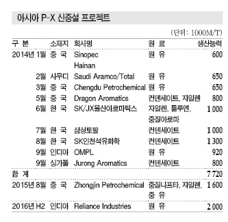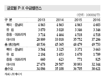 아시아 P-X 수급은 2014년 생산능력 770만톤이 추가되며 공급과잉이 우려됐으나 2014년 말 정기보수를 이유로 가동을 중단한 싱가폴 Jurong Aromatics 80만톤과 2015년 4월 화재로 가동을 중단한 Dragon Aromatics 160만톤 플랜트가 2016년 2월까지도 가동을 재개하지 못해 수급타이트 현상이 계속됐다.