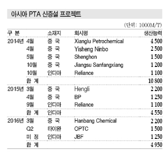 PTA는 신규 프로젝트가 다수 진행되고 있으며 2015년 중국과 인디아에서만 총 455만톤이 가동을 시작했고 2016년에도 중국, 타이완, 인디아에서 총 500만톤의 신규가동이 예정돼 있으나 공급과잉이 지속돼 프로젝트가 지연 혹은 중단될 가능성이 제기되고 있다.