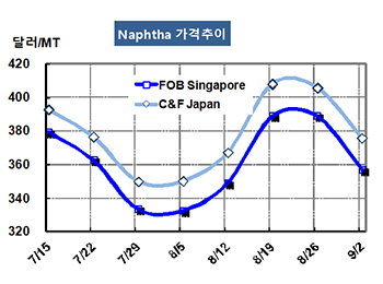 나프타 가격은 9월2일 CFR Japan 톤당 376달러로 30달러 폭락했고 FOB Singapore 역시 357달러로 32달러 떨어졌다.
