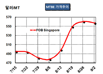 표, 그래프 : < MTBE 가격추이> <화학저널 2016/09/08> |