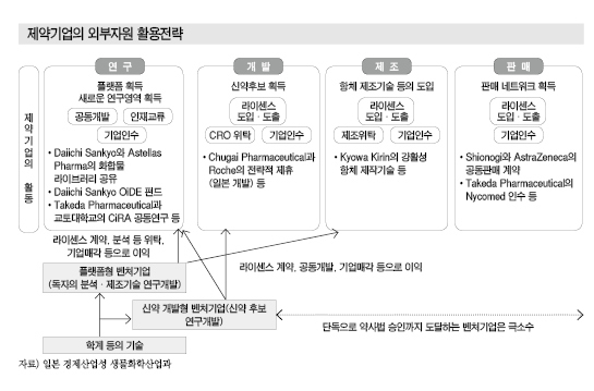 일본 제약기업들은 개발, 연구부문에 벤처기업, 학계 등과 제휴를 모색하는 전문부서를 설치하고 있으며, 벤처기업들도 제약기업과의 제휴를 목표로 제약기업을 방문해 자사기술을 판매하는 전략을 추진하고 있다.