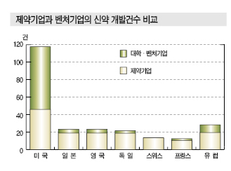 세계 최대의 의약품 시장으로 신약 연구능력이 뛰어난 미국은 벤처·학계에서 개발해 인가된 신약 비율이 50%를 넘는 것으로 파악되고 있다. 경쟁국가와는 상이한 흐름으로, 미국은 바이오 벤처기업이 신약 연구를 주도하고 있다.
