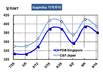 나프타(Naphtha)는 다시 400달러가 무너졌다. 나프타 가격은 9월16일 CFR Japan 톤당 394달러로 16달러 하락했고 FOB Singapore 역시 381달러로 13달러 떨어졌다. 표, 그래프 : < Naphtha 가격추이 > <화학저널 2016/09/19> |