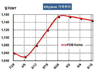 에틸렌(Ethylene)은 약하지만 하락세를 지속했다. 에틸렌 가격은 9월16일 FOB Korea 톤당 1145달러로 5달러 하락했고 CFR SE Asia도 1055달러로 5달러 떨어졌다. CFR NE Asia 역시 5달러 하락해 1185달러를 형성했다. 표, 그래프 : < Ethylene 가격추이 > <화학저널 2016/09/19> |