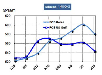 톨루엔 가격은 9월16일 FOB Korea 톤당 581달러로 20달러 하락했고 CFR SE Asia도 614달러로 19달러 떨어졌다. CFR Taiwan은 610달러로 23달러, CFR India는 641달러로 24달러 급락했다.