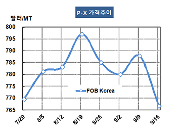 P-X 가격은 9월16일 FOB Korea 톤당 767달러로 21달러 하락했고 CFR SE Asia 역시 783달러로 21달러 떨어졌다.