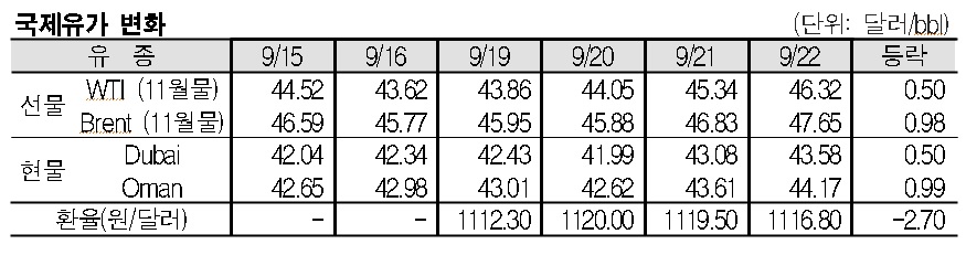 9월22일 국제유가는 미국의 공급과잉 해소 기대감, 미국 달러화 약세 등으로 상승했다.
