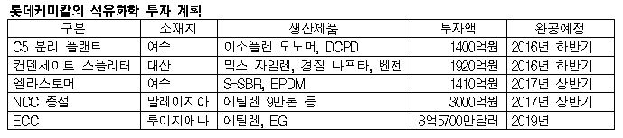 롯데케미칼도 ESS(Energy Storage System), 바이오 등 신 사업 개척을 추진하고는 있으나 대규모 투자는 석유화학 중심인 것으로 알려졌다.