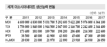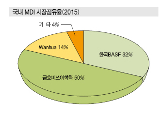 MDI는 국내 생산능력이 금호미쓰이화학 22만-23만톤, 한국BASF 24만톤으로 금호미쓰이화학은 2017년 MDI 생산능력을 33만톤으로 10만톤 확대할 방침이다.