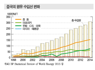 중국은 수입처를 분산·다양화한 결과 아프리카산 원유 수입량이 1990년대 중반 200만톤 이하에서 2014년 5300만톤까지 증가해 전체 석유 수입량 가운데 아프리카산이 차지하는 비율이 10%에서 20%로 상승했고, 러시아·중앙아시아산도 10만톤 이하에서 4000만톤 수준으로 폭증해 0.2%에서 13%로 대폭 상승했다.