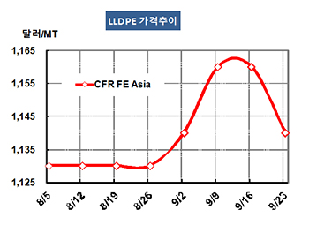 LLDPE(Linear Low-Density Polyethylene)는 하락세를 본격화했다. LLDPE 가격은 9월21일 CFR FE Asia 톤당 1140달러로 20달러 하락했고 CFR SE Asia도 1170달러로 30달러 급락했다. CFR S Asia도 1190달러로 20달러 떨어졌다. 표, 그래프 : < LLDPE 가격추이 > <화학저널 2016/09/26> |