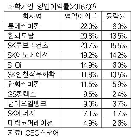 롯데케미칼(대표 허수영)은 2016년 상반기 영업이익률이 30대 그룹 석유화학기업 가운데 가장 높은 것으로 나타났다. 영업이익률 순위는 롯데케미칼에 이어 한화토탈(20.8%), SK루브리컨츠(20.7%), SK이노베이션(19.2%), S-Oil(14.9%), SK인천석유화학(11.8%), 한화케미칼(11.5%), GS칼텍스(9.5%), 현대오일뱅크(9.0%), SK에너지(7.1%), 대림코퍼레이션(4.9%)이 뒤를 이었다. 표, 그래프: <화학기업 영업이익률(2016.Q2)> <화학저널 2016/09/26> |