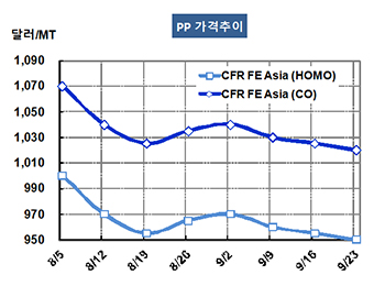 PP(Polypropylene)는 하락세를 지속했다. PP 가격은 9월21일 Raffia 및 Injection 그레이드 기준 CFR FE Asia 톤당 950달러로 5달러 하락했고 CFR SE Asia 역시 1000달러로 10달러 떨어졌다. IPP Film 및 BOPP는 FEA가 970달러 및 965달러를 형성했고 SEA는 1020달러 및 1015달러로 10달러 하락했다. 표, 그래프 : < PP 가격추이 > <화학저널 2016/09/27> |