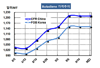 부타디엔(Butadiene)는 폭락을 예비한 채 보합세를 형성했다. 부타디엔 가격은 9월23일 FOB Korea 톤당 1150달러로 변동이 없었고 CFR SE Asia 역시 1140달러로 보합세를 형성했다. 표, 그래프 : < Butadiene 가격추이> <화학저널 2016/09/27> |