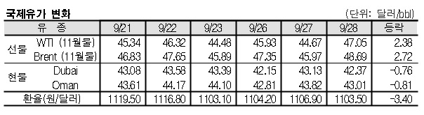 9월28일 국제유가는 OPEC(석유수출국기구)의 생산한도 설정 합의, 미국의 원유 재고 및 생산 감소 등으로 상승했다.