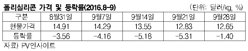 폴리실리콘(Polysilicon)은 가격 하락세가 장기화하면서 12달러 중반까지 떨어졌다. 표, 그래프 : <폴리실리콘 가격 및 등락률(2016.8-9)> <화학저널 2016/09/29> |