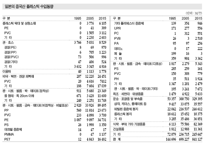 중국은 2015년 일본에게 플래스틱 가공제품을 84만1127톤 수출했다.