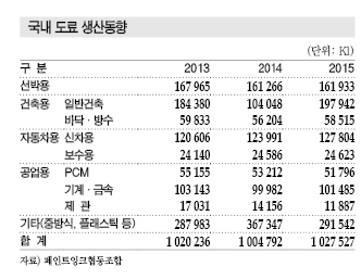 선박용 도료는 신규 발주가 감소한 가운데 보수용 도장 주기도 길어져 투입물량이 감소하고 있다.
