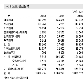 선박용 도료는 기존의 수주물량이 남아 있기 때문에 2016년까지 도장작업을 예정대로 진행할 예정이나 이후에는 수주실적 부진에 따른 동반 침체가 불가피해지고 있다.