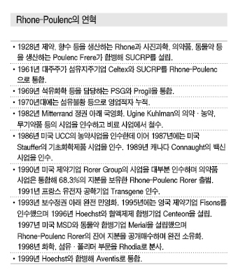 독일 Hoechst가 1998년 말 프랑스 Rhone-Poulenc(RP)의 라이선스 사업과 통합을 통해 Aventis를 출범시킨 것은 제약 뿐만 아니라 전통적으로 화학강국이던 독일과 프랑스의 사업체계에 파란을 일으킨 분리 및 재통합의 전형으로 손꼽히고 있다.