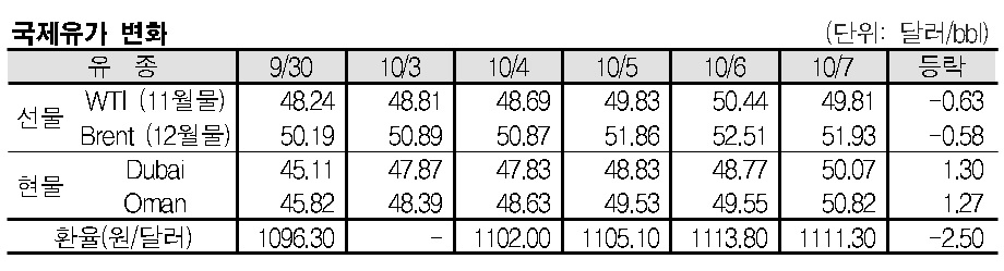 10월7일 국제유가는 산유국의 감산 합의 기대감 하락, 미국의 원유 시추리그 수 증가 등으로 하락했다. 10월7일 국제유가는 산유국의 감산 합의 기대감 등으로 하락했다. 표, 그래프: <국제유가 변화> <화학저널 2016/10/10> |