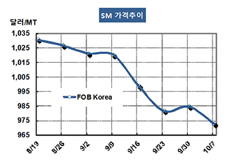 SM(Styrene Monomer)은 다시 하락세를 시작했다. SM 가격은 10월7일 FOB Korea 톤당 973달러로 12달러 하락했고 CFR SE Asia도 1012달러로 12달러 떨어졌다. CFR India 역시 1008달러로 12달러 하락했다. 표, 그래프 : < SM 가격추이 > <화학저널 2016/10/12> |