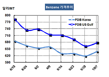 벤젠(Benzene)은 하락세를 멈추고 상승했다. 벤젠 가격은 10월7일 FOB Korea 톤당 638달러로 20달러 상승했고 FOB SE Asia는 627달러, CFR China는 646달러를 형성했다. 표, 그래프 : < Benzene 가격추이 > <화학저널 2016/10/12> |