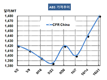 ABS(Acrylonitrile Butadiene Styrene)는 폭등세를 지속했다. ABS 가격은 10월19일 CFR China 톤당 1480달러로 40달러 폭등했고 CFR SE Asia도 1460달러로 41달러 올랐다. 표, 그래프 : < ABS 가격추이 > <화학저널 2016/10/26> |