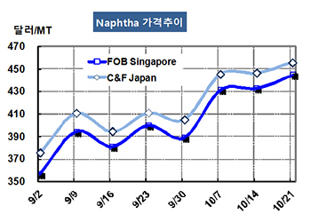 나프타(Naphtha)는 초강세를 지속하고 있다. 나프타 가격은 10월21일 CFR Japan 톤당 456달러로 10달러 상승했고 FOB Singapore 역시 445달러로 12달러 올랐다. 표, 그래프 : < Naphtha 가격추이 > <화학저널 2016/10/28> |