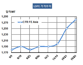 LDPE(Low-Density Polyethylene)는 급등세를 지속했다. LDPE 가격은 10월26일 CFR FE Asia 톤당 1280달러로 30달러 상승했으나 CFR SE Asia는 1260달러로 10달러 오르는데 머물렀다. 표, 그래프 : < LDPE 가격추이 > <화학저널 2016/10/31> |