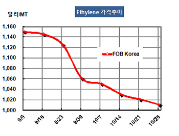 에틸렌(Ethylene)은 상승 동력을 상실한 것으로 판단된다. 에틸렌 가격은 10월28일 FOB Korea 톤당 1010달러로 10달러 떨어졌고 CFR SE Asia도 1020달러로 10달러 하락했다. CFR NE Asia 역시 10달러 하락해 1050달러를 형성했다. 표, 그래프 : < Ethylene 가격추이 > <화학저널 2016/10/31> |