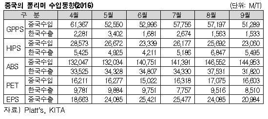 중국은 PS(Polystyrene) 수입이 줄어들고 ABS(Acrylonitrile Butadiene Styrene) 수입이 늘어나고 있다. 그러나, 한국산은 4월 3만3525톤에서 9월 3만1820으로 1705톤 감소했다. 표, 그래프 : < 중국의 폴리머 수입동향(2016) > <화학저널 2016/11/03> |