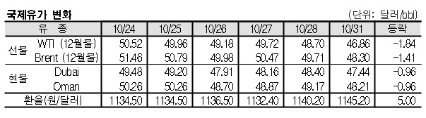 10월31일 국제유가는 산유국의 감산 협력에 대한 기대 약화, OPEC(석유수출국기구) 원유 생산량 증가, 미국 쿠싱지역의 원유 재고 증가, 미국 달러화 가치 상승 등으로 하락했다. 10월31일 국제유가는 산유국의 감산 협력에 대한 기대가 약화된 영향으로 하락했다. 표, 그래프 : < 국제유가 변화 > <화학저널 2016/11/01> |