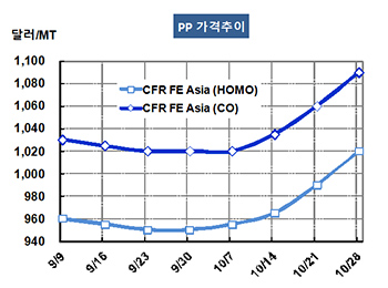 PP(Polypropylene)는 1000달러를 넘어섰다. PP 가격은 10월26일 Raffia 및 Injection 그레이드 기준 CFR FE Asia 톤당 1020달러로 30달러 급등했으나 CFR SE Asia는 1040달러로 15달러 오르는데 그쳤다. IPP Film 및 BOPP도 FEA가 1040달러 및 1035달러로 30달러 급등했으나 SEA는 1060달러 및 1050달러로 15달러 상승에 머물렀다. 표, 그래프 : < PP 가격추이 > <화학저널 2016/11/01> |