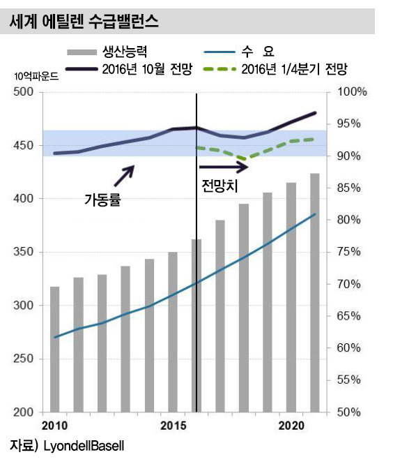 글로벌 에틸렌 생산능력은 2016년 1억6329만톤에서 2020년 1억9278만톤으로 2949만톤 확대되며, 수요는 2016년 1억4742만톤에서 2020년 1억7690만톤으로 2948만톤 늘어나 평균 가동률이 94-95%를 유지할 것으로 예상했다.