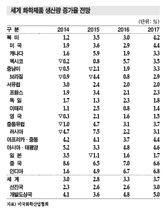세계 화학제품 생산량 증가율은 2015년 3.6%에서 2016년 3.4%로 소폭 둔화될 것으로 예측했다.