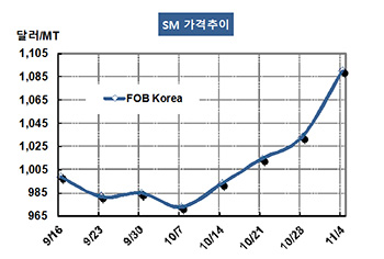 SM(Styrene Monomer)은 의외의 강세를 지속하고 있다. SM 가격은 11월4일 FOB Korea 톤당 1090달러로 57달러 폭등했고 CFR SE Asia도 1132달러로 59달러 올랐다. CFR India 역시 59달러 폭등해 1128달러를 형성했다. 표, 그래프 : < SM 가격추이 > <화학저널 2016/11/09> |