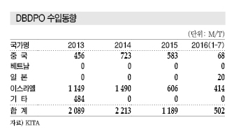 국내 DBDPO 수입은 수요가 감소함에 따라 2014년 2213톤에서 2015년 1189톤으로 줄었고 2016년 1-7월 502톤으로 감소세를 지속하고 있다.