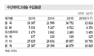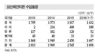 국내 수산화마그네슘 수입은 2013년 2만5387톤, 2014년 2만9398톤 2015년 4만6079톤으로 매년 증가세를 지속했고 2016년 1-7월에도 1만8845톤을 기록했다.