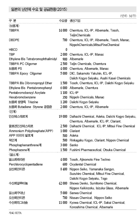 브롬계 난연제는 글로벌 환경규제 강화로 점차 설자리를 점차 잃어가고 있고, 일본은 2015년 브롬계 난연제 수요가 감소한 것으로 나타났다.